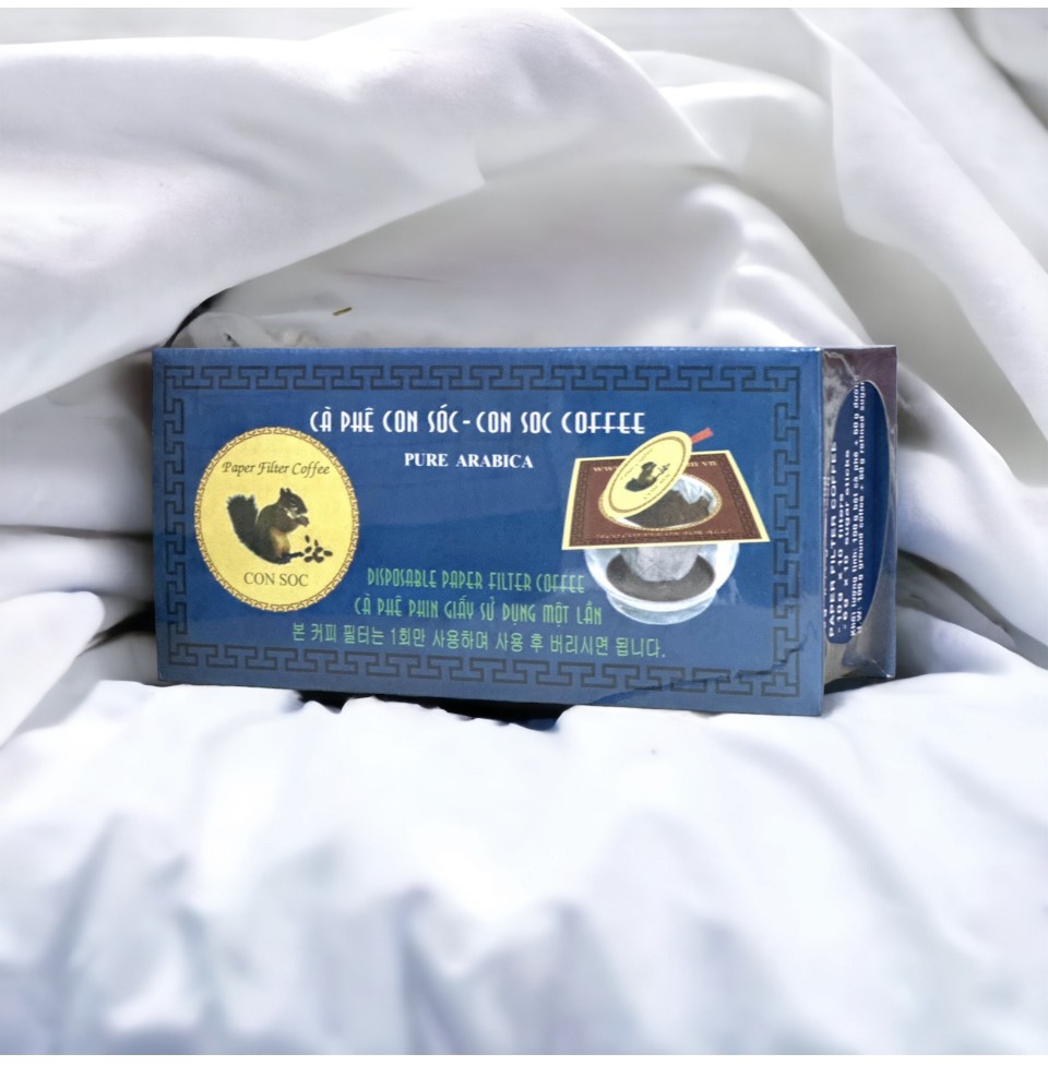 Cà Phê Con Sóc được tuyển lựa từ nguyên liệu trồng ở vùng cao nguyên Lâm Đồng ( Đà Lạt ) ở độ cao 1.500m so với mực nước biển. Ở tại vùng đất này thiên nhiên ở đây thật tuyệt vời, khí hậu và đất Basalt rất thích hợp phát triển cho giống cây cà phê Arabica ( cà phê chè). Nay sản phẩm được chế biến dưới dạng phin lọc-đựng trong hộp.