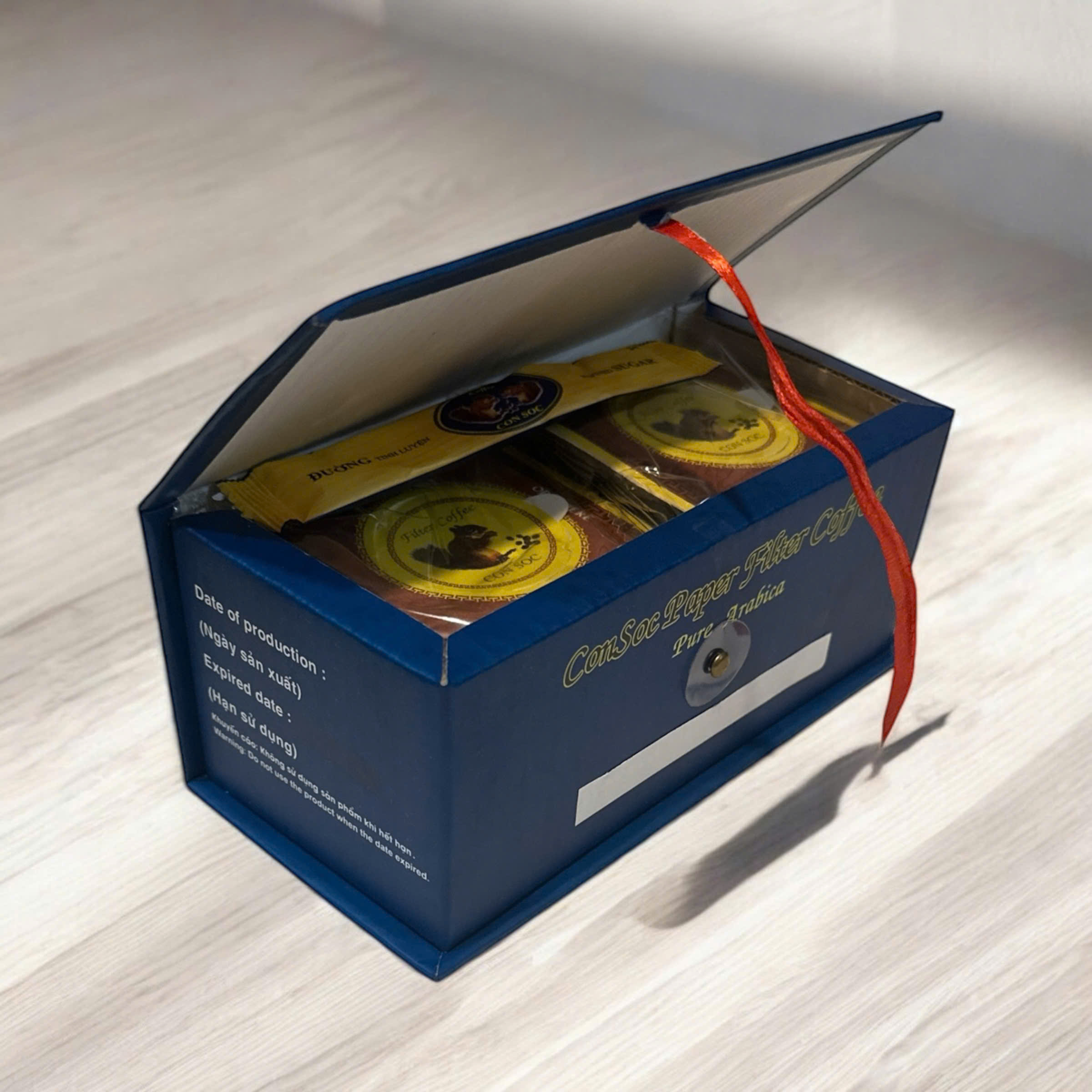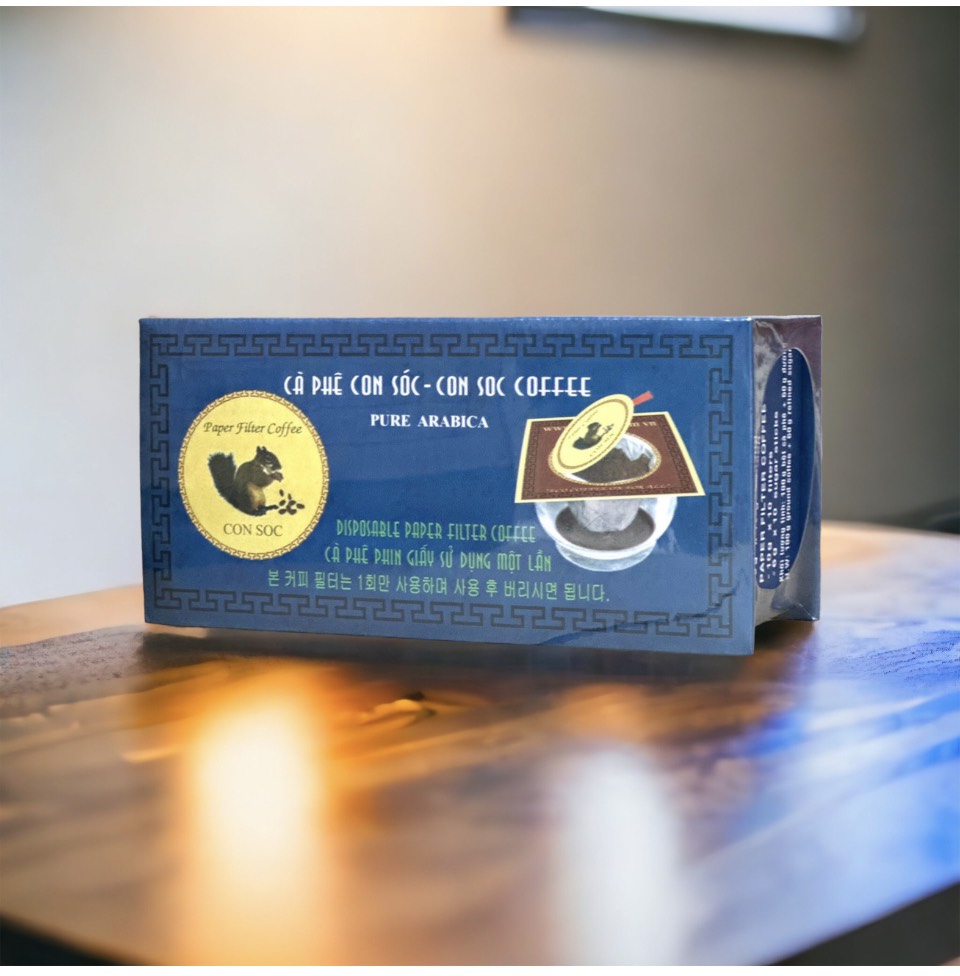 Hộp Cà phê Con Sóc Xanh tỷ lệ 100% Arabica đóng trong phin lọc - Được đăng ký bảo hộ thương hiệu.